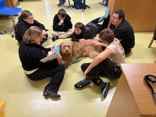 Unsere Therapiehündin Shelby besucht unsere Schulklassen einmal wöchentlich. Sie wird von einer für den pädagogischen Hundeeinsatz ausgebildeten, Begleitperson Monika Rauscher vom Team Herzenshunde geführt. Therapiehunde sind speziell auf ihre Eignung getestet, entsprechend ausgebildet und werden regelmäßig überprüft. Zu den Zielsetzungen gehören die altersgerechte Wissensvermittlung über Hunde wie: